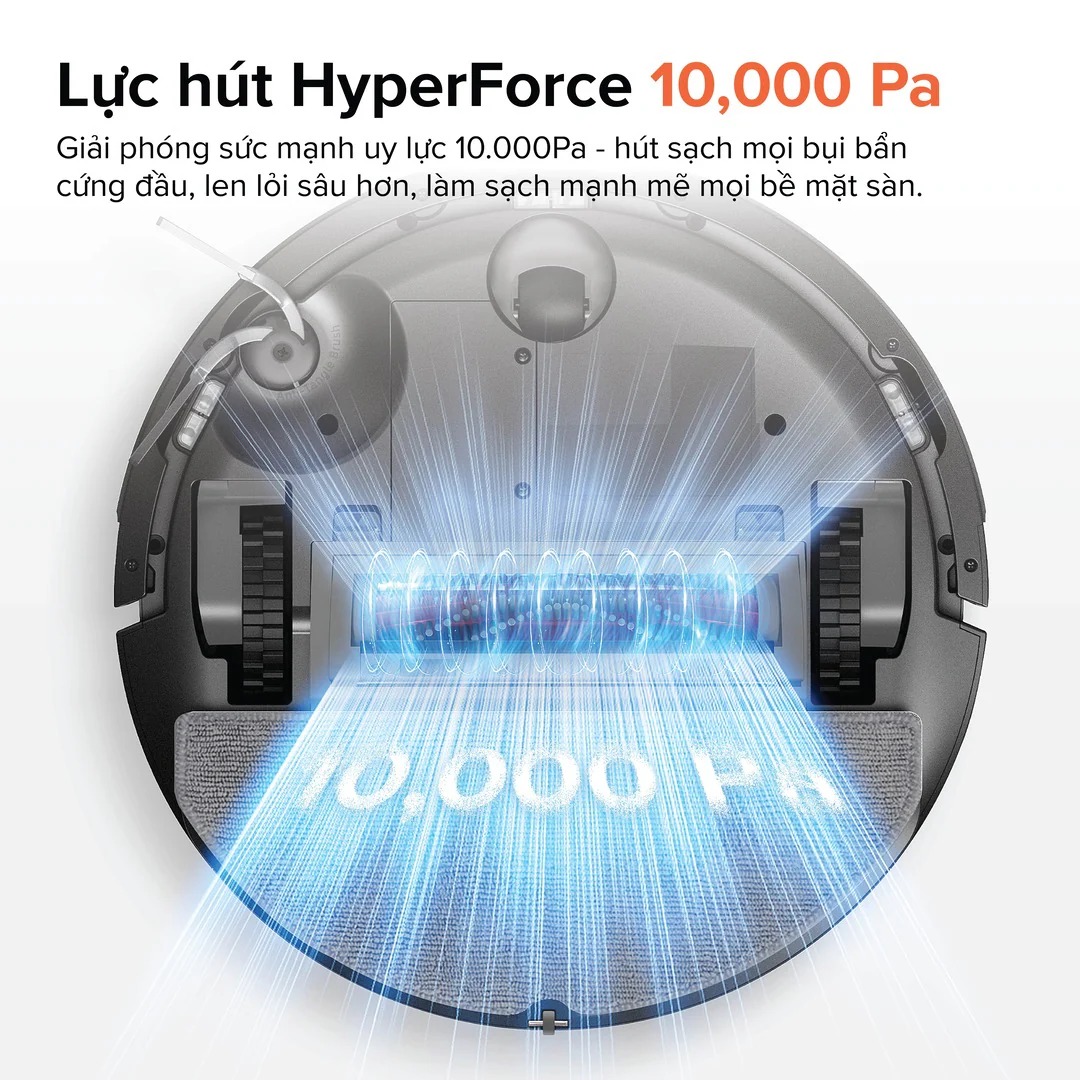 - Lực hút mạnh HyperForce 10.000 Pa: làm sạch mạnh mẽ trên mọi bề mặt sàn